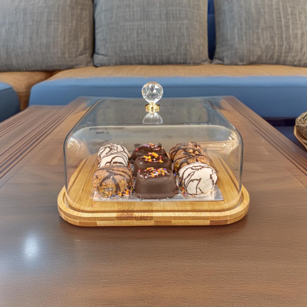 تبسي خشبية مربعة لتقديم الحلويات مع غطاء أكريليك شفاف