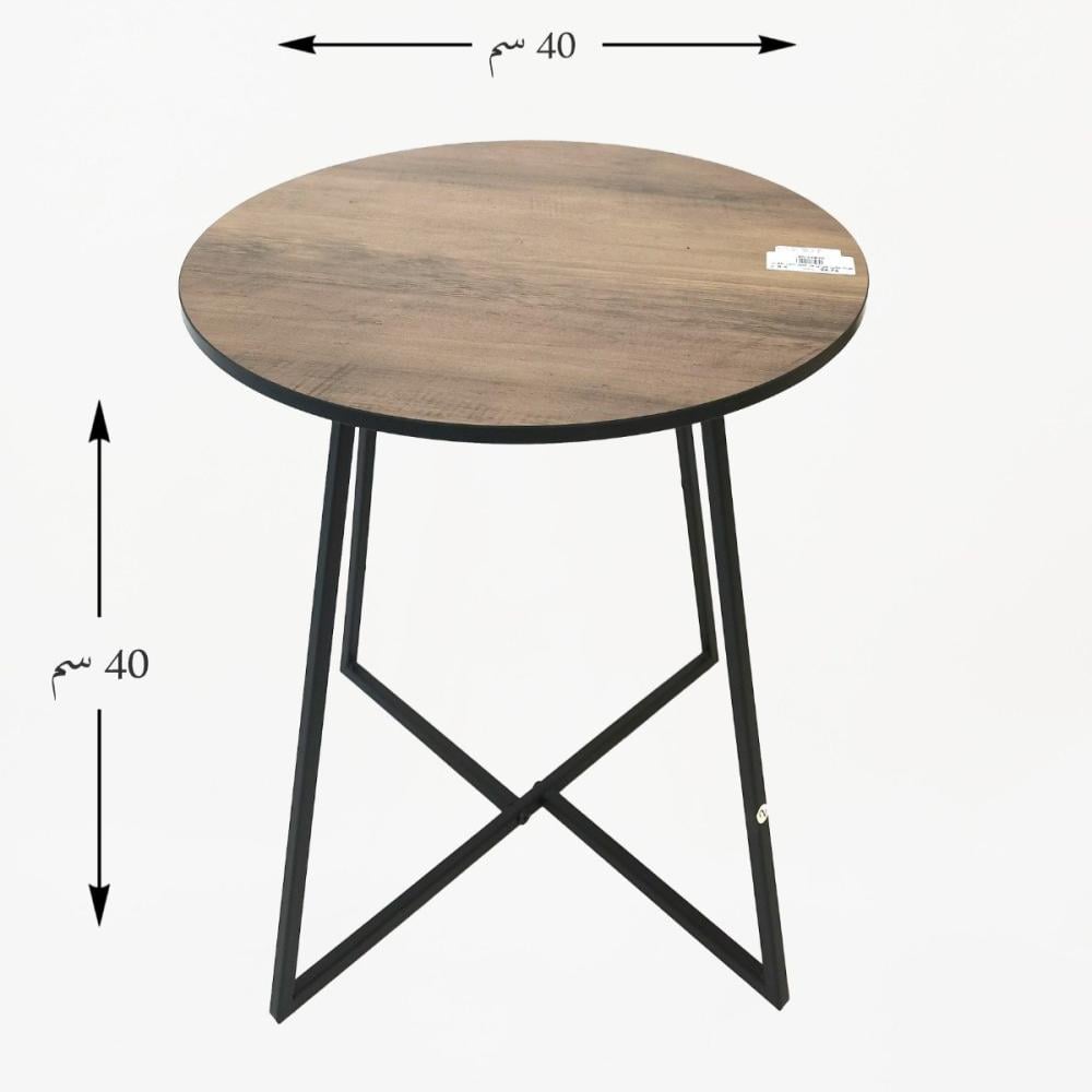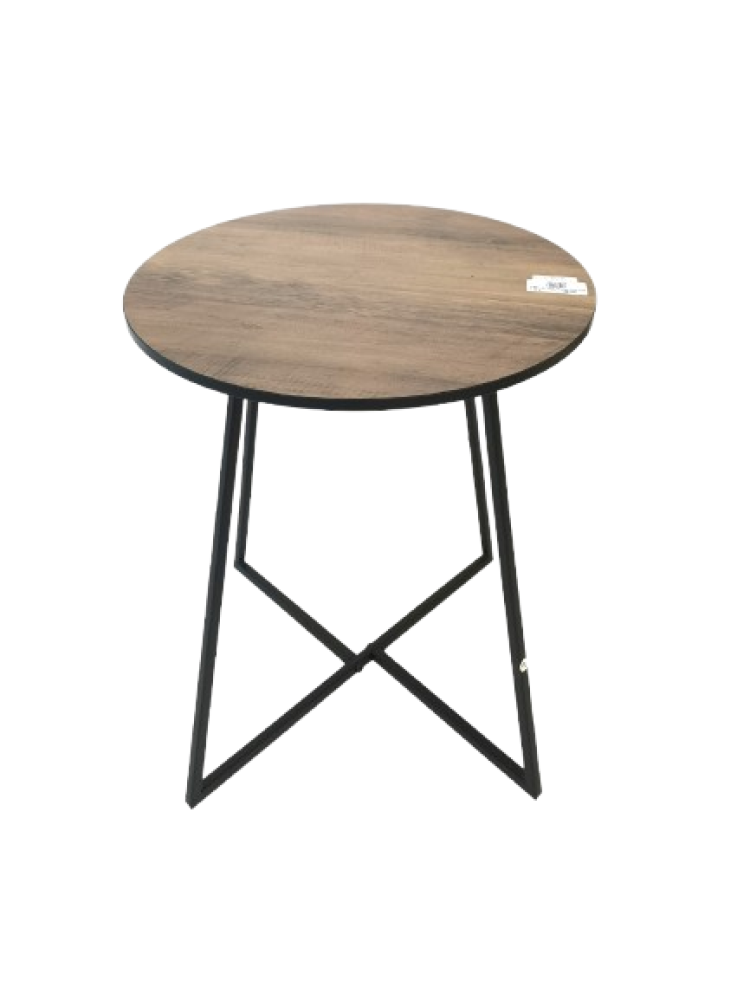 - طاولة دائرية بتصميم عصري أنيق، تتميز بسطح خشبي بلون بني طبيعي وهيكل معدني أسود متقاطع يمنحها ثباتًا وأناقة.