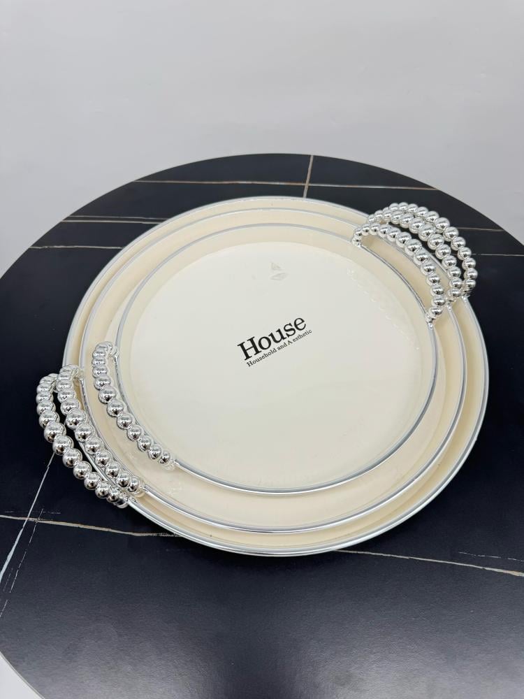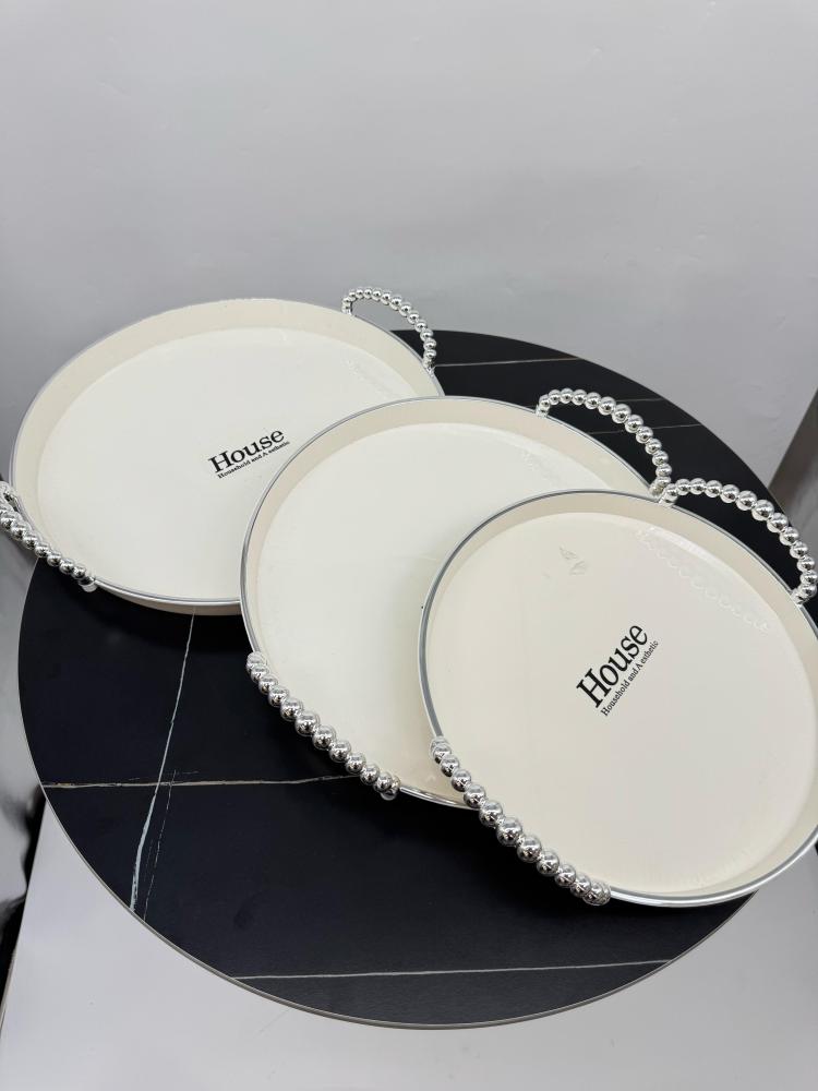 مجموعة تقديم أنيقة تتكون من ثلاث صوانٍ دائرية بتصميم عصري يجمع بين الفخامة والعملية.