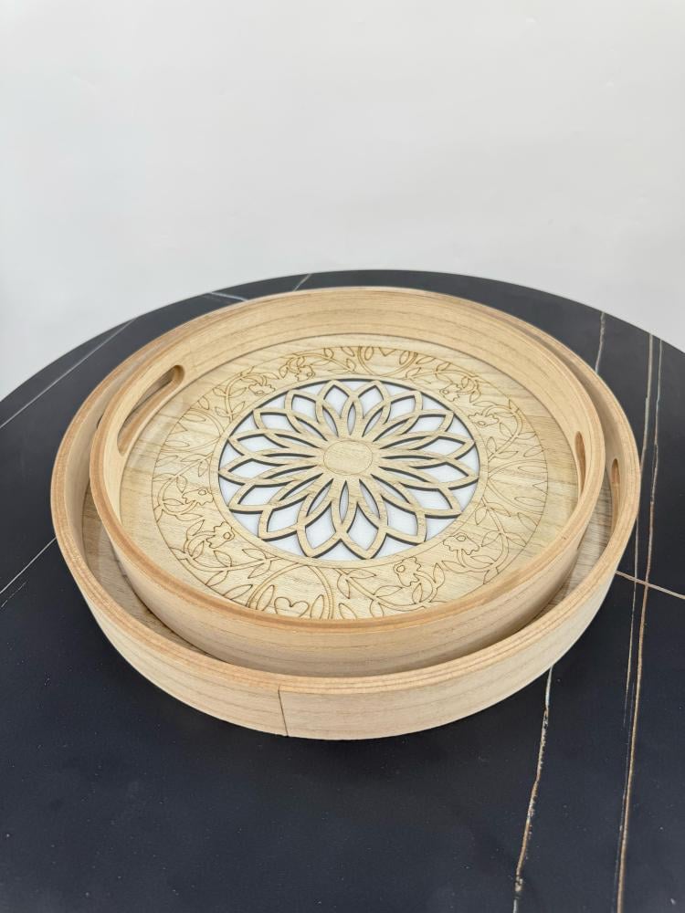 عبارة عن 2 صينية دائرية بتصميم أنيق وفني.