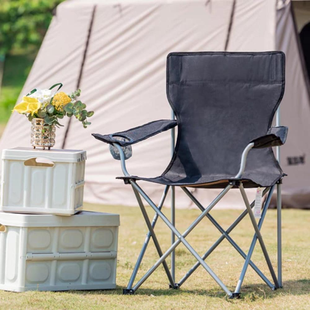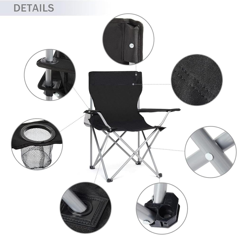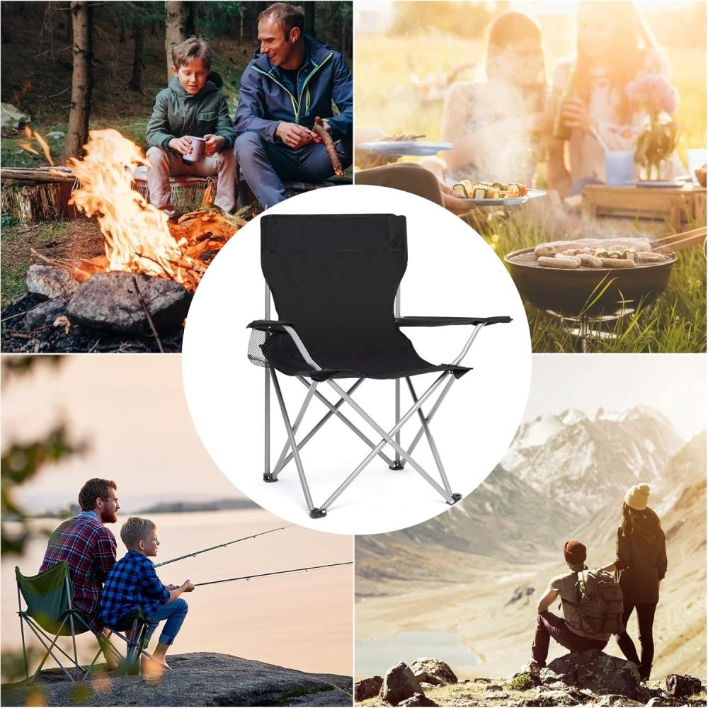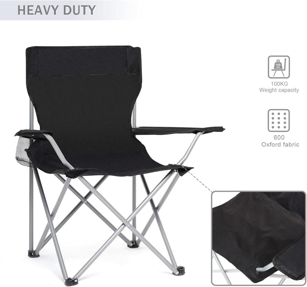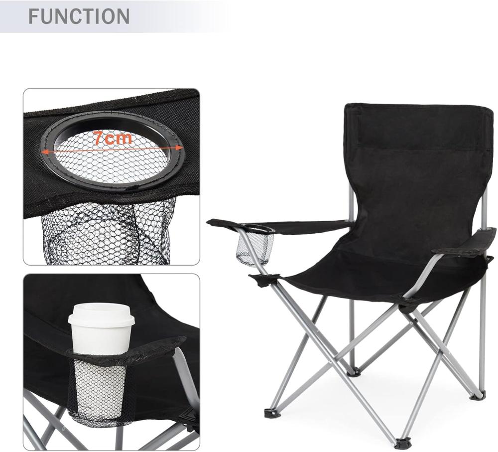 كرسي تخييم قابل للطي باللون الأسود مع حامل أكواب وحقيبة حمل – تصميم أنيق ومتين للرحلات والمخيمات