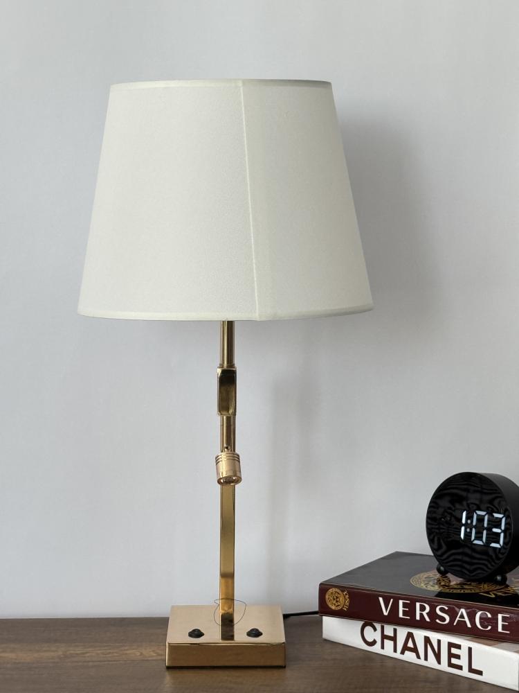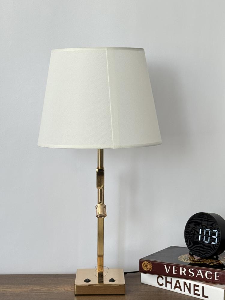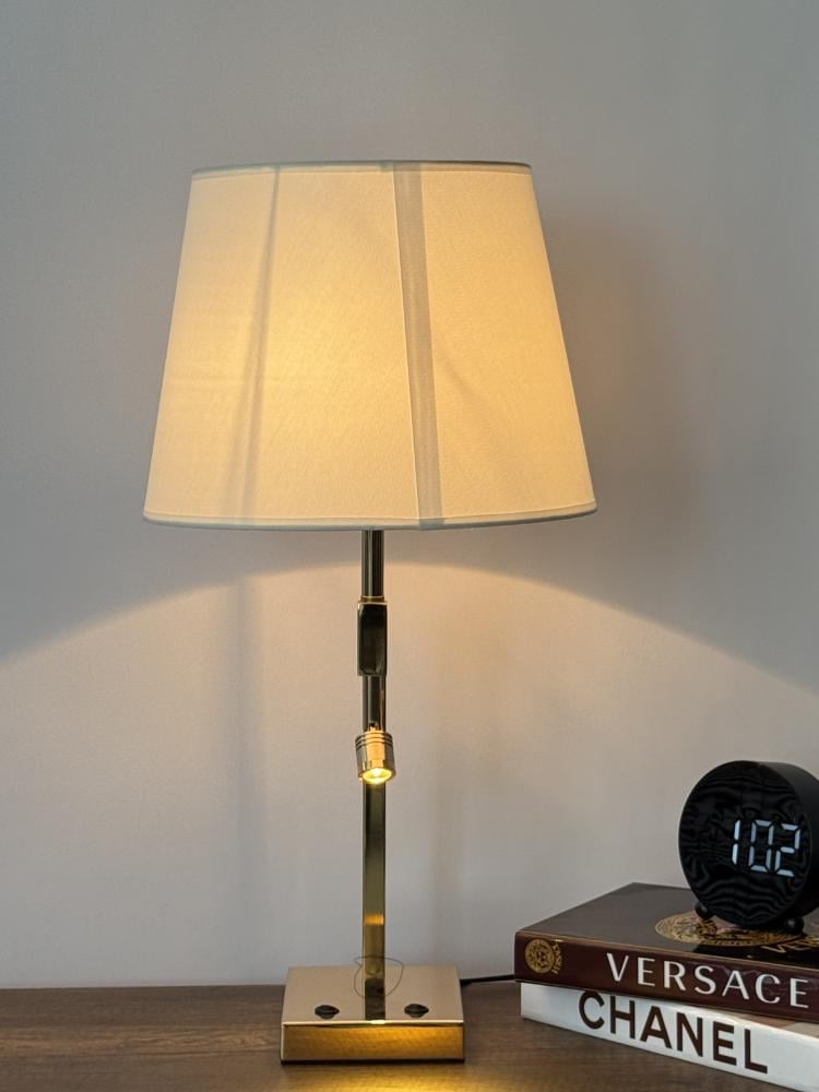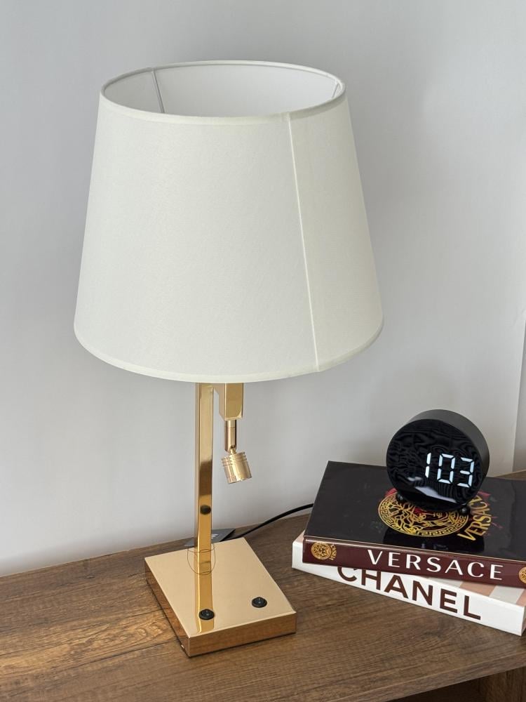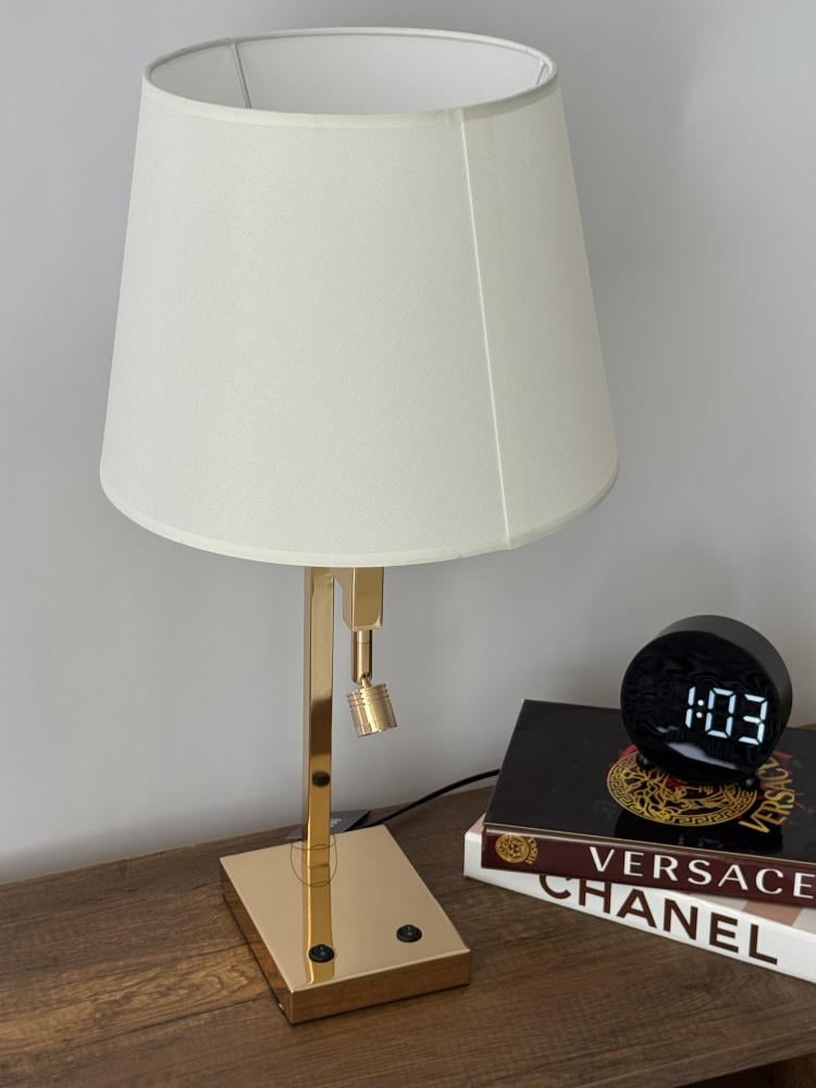 - يتميز هذا المصباح بقاعدة معدنية ذهبية لامعة تمنح المكان طابعًا فخمًا وعصريًا، بينما يغطيه غطاء قماشي أبيض أنيق ينشر إضاءة ناعمة ومريحة للعين.