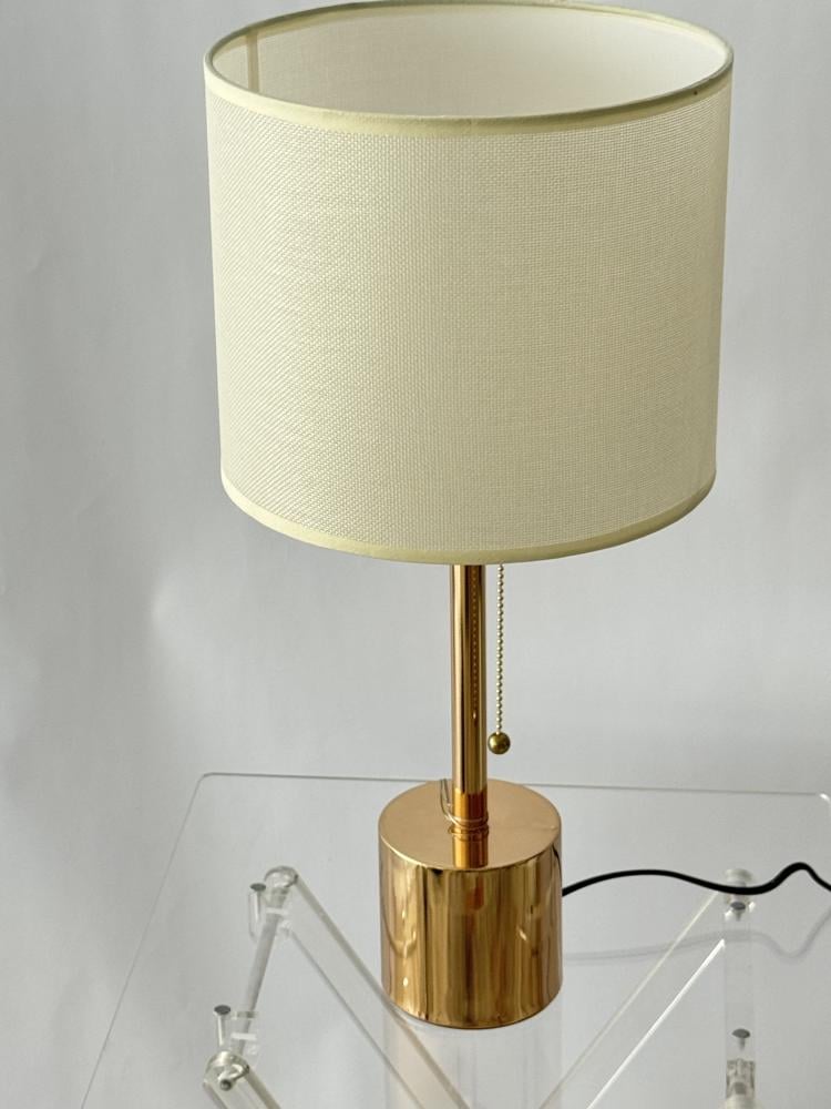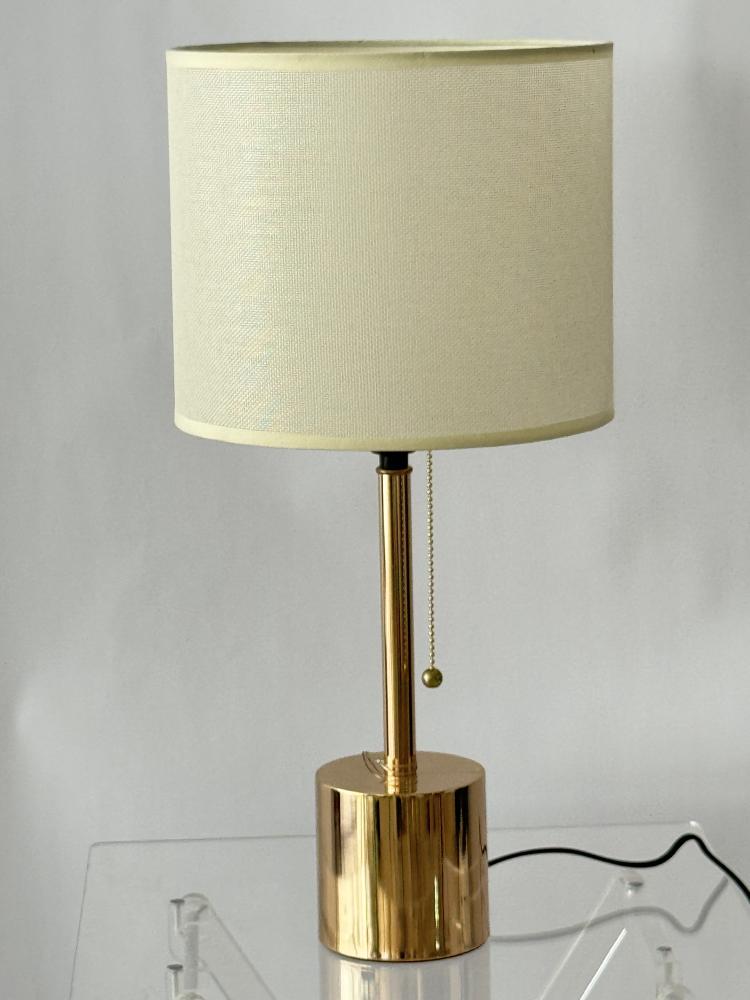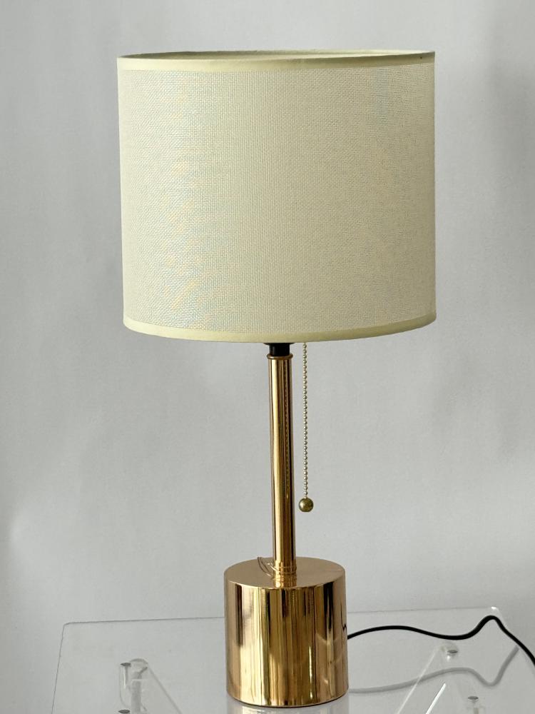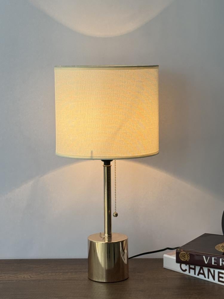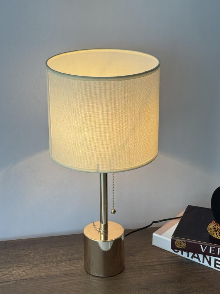 مصباح طاولة بقاعدة أسطوانية ذهبية وغطاء كتان بيج – تصميم فاخر