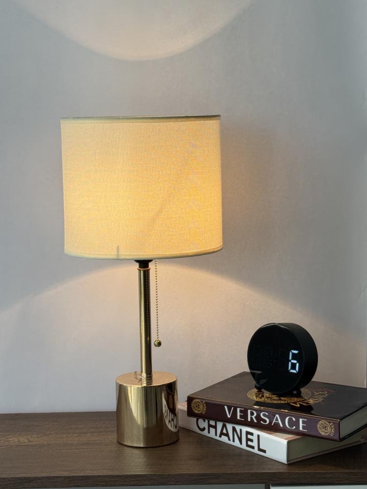 • يتميز بقاعدة أسطوانية ذهبية مصقولة تضيف لمسة فخمة، مع عمود مستقيم وغطاء كتان بيج يعزز من توزيع الإضاءة بشكل ناعم ودافئ. زر التشغيل بالسلسلة المعدنية يوفر طريقة تشغيل سهلة وعملية.